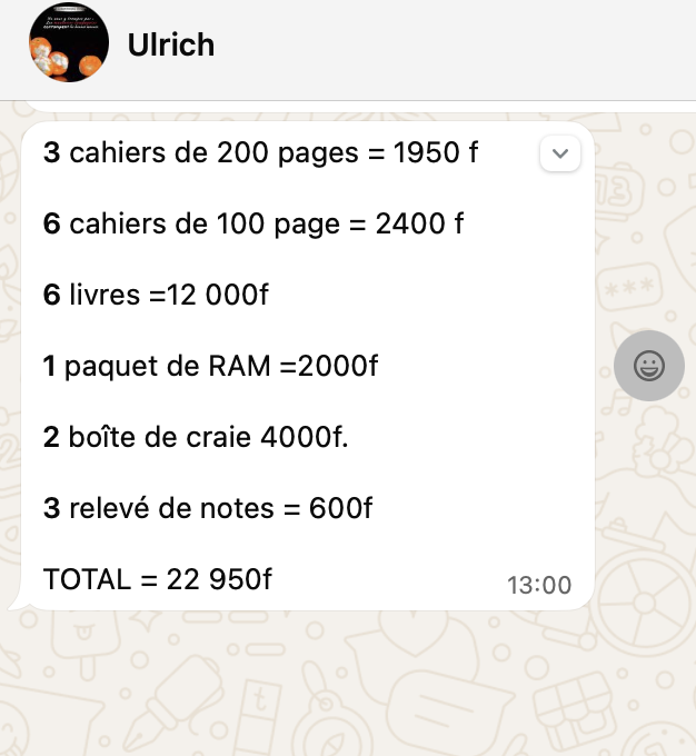 A Ulrich pour le transport et nourriture de la semaine (formation Desnos, David, Chadrac et Akim) |